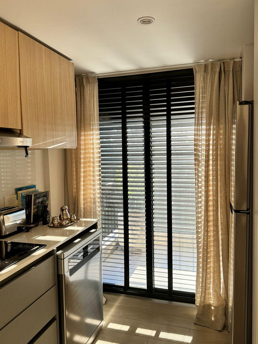Gasa Tusor y Horizontales de Madera Negra 50 mm con Cinta a tono.